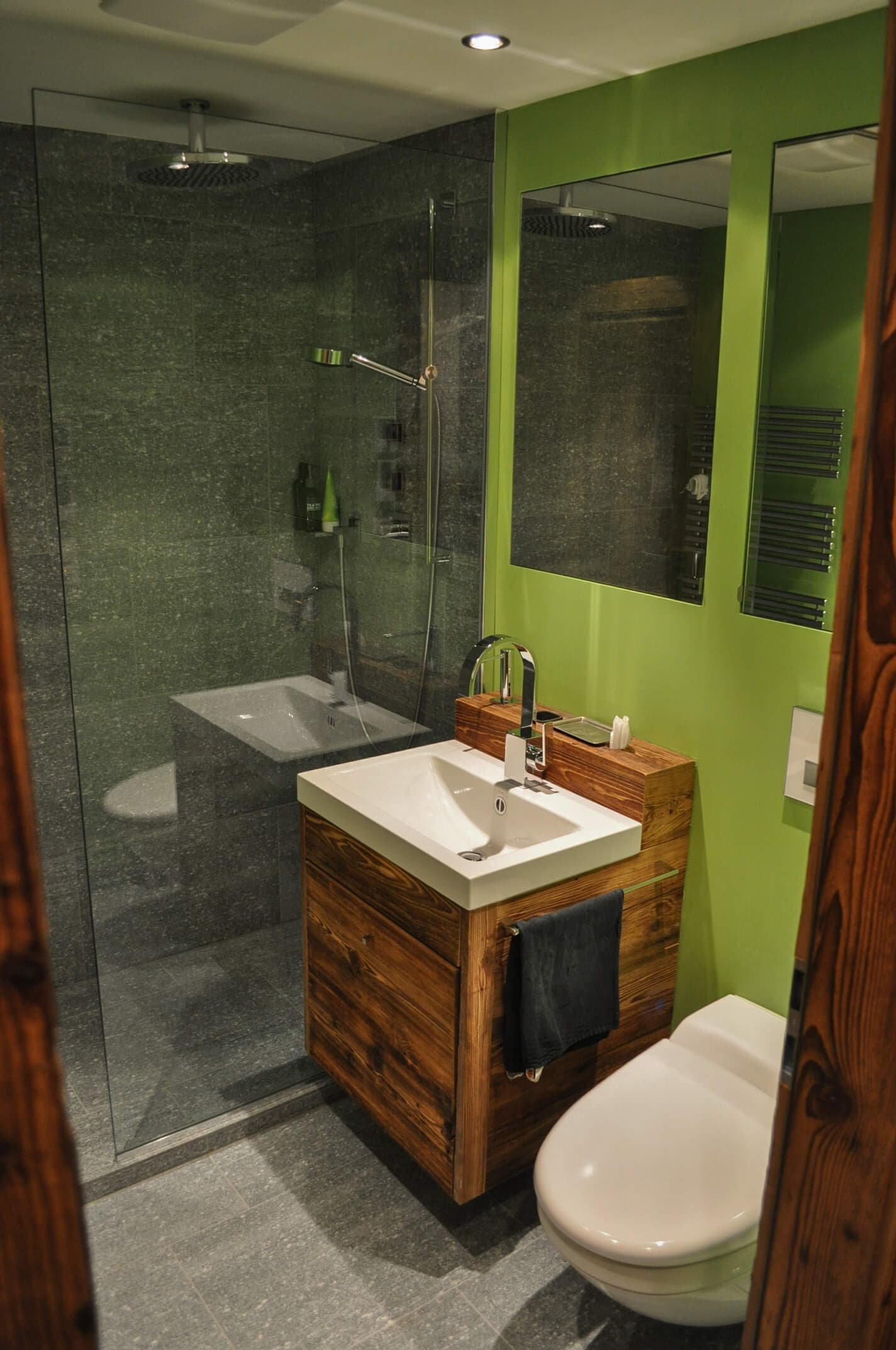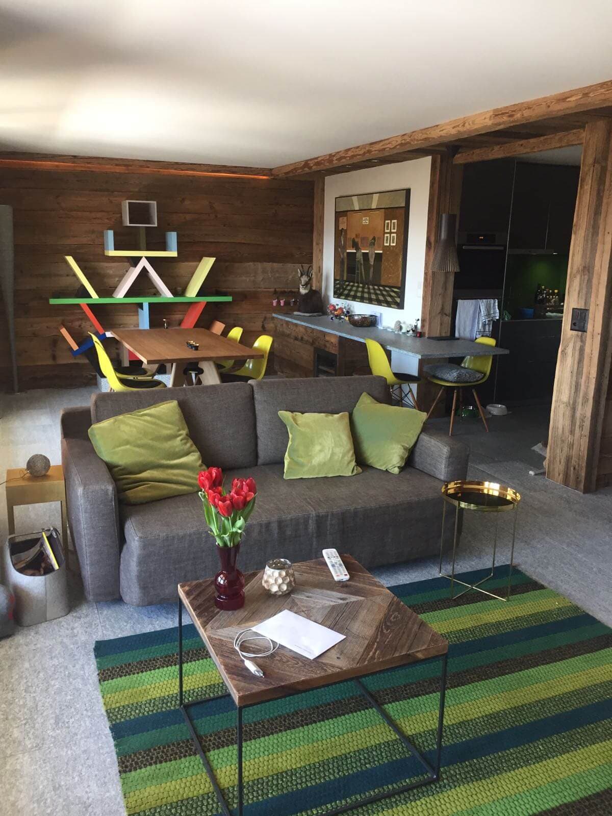 Appartement Camille Deux appartements de 2,5 pièces réunis en un seul: le mur mitoyen a été abattu pour créer un grand séjour ouvert, complété de deux chambres et deux salles de bain indépendantes. Les murs du séjour sont habillés de vieux bois brut sur toute leur hauteur, rythmés par les poutres et poteaux d'origine laissés apparents. Le sol en carrelage ardoise gris court dans tout l'espace de vie. La cuisine, séparée par un comptoir en granite flammé et cave à vin encastrée, affiche des façades anthracite mat et une crédence vert vif. Dans la chambre, la tête de lit est entièrement intégrée dans la structure en vieux bois. Rangements suspendus, étagère et papier peint à carreaux rouges en fond de niche.