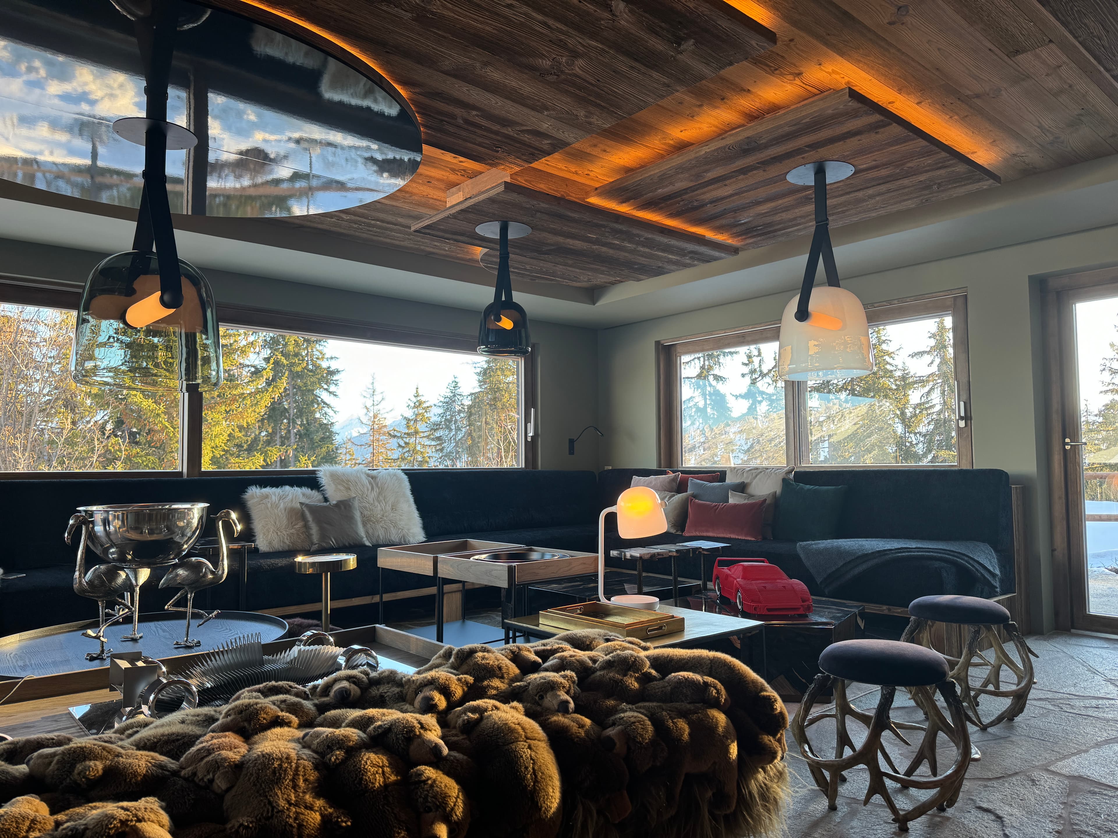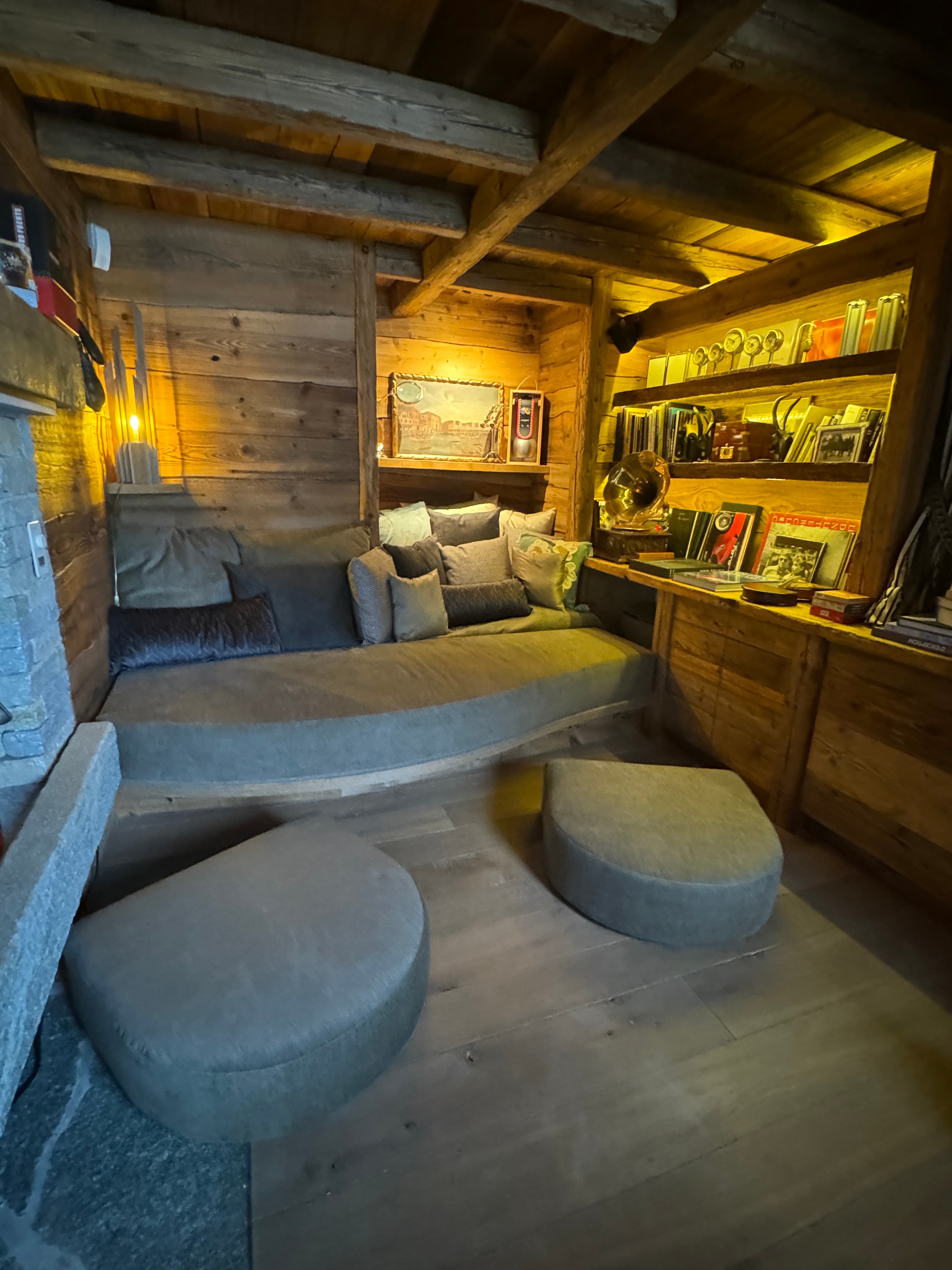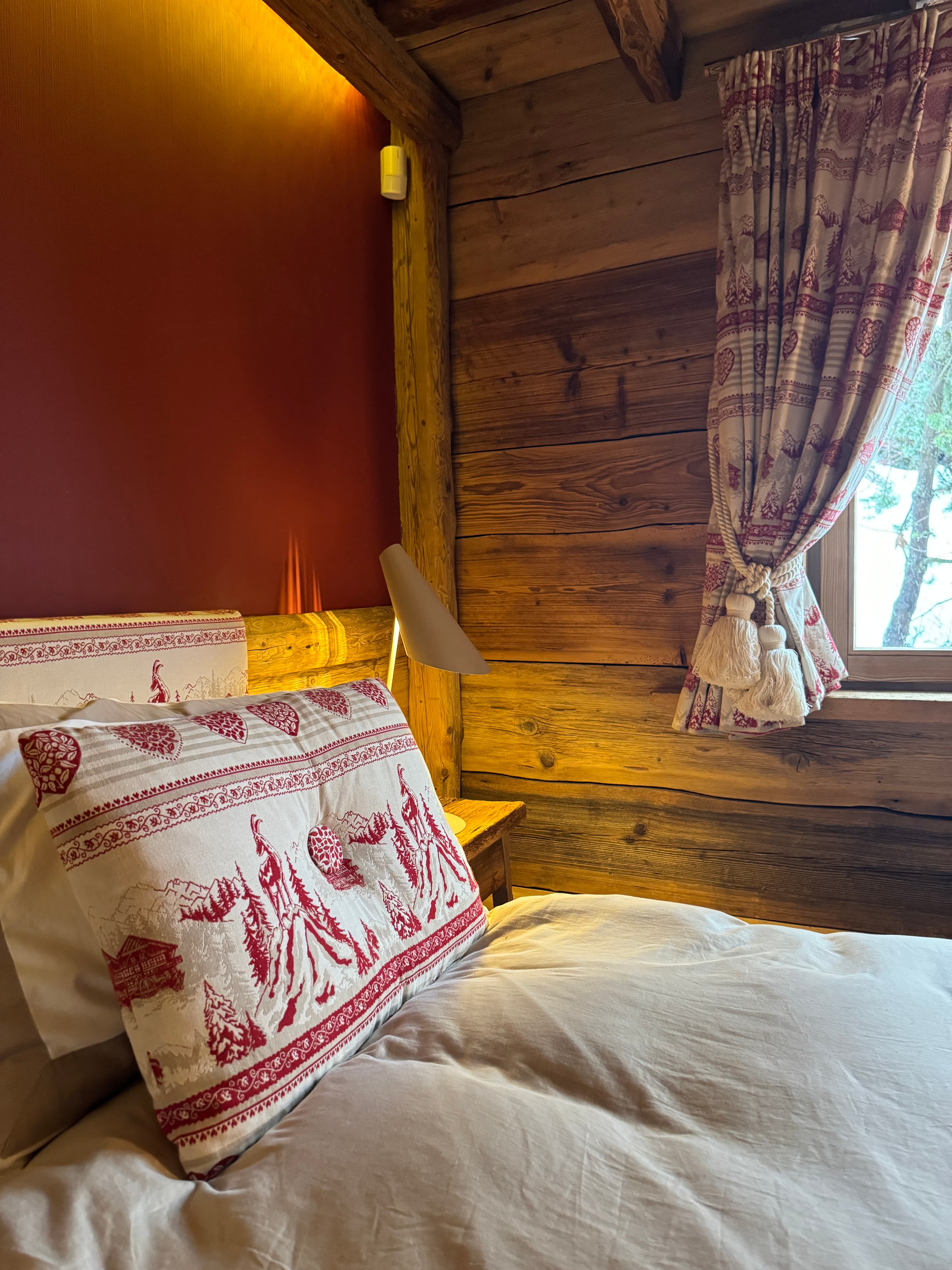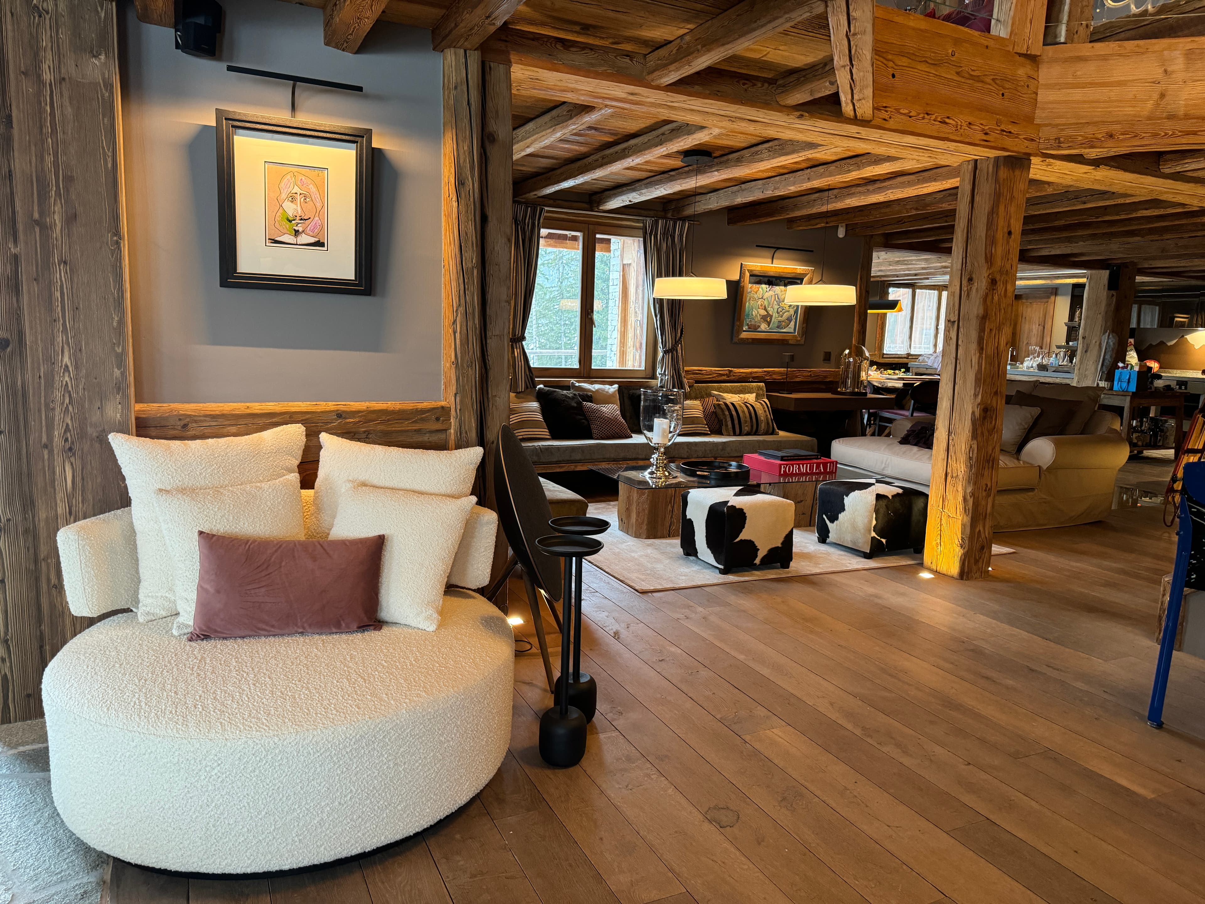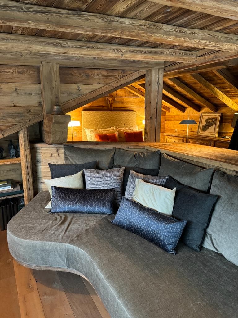Chalet Kadelpapéo Plusieurs niveaux, plusieurs ambiances, le chalet se déploie comme un récit. Vieux bois et charpente apparente posent le cadre ; le mobilier de créateur, les œuvres d'art et un flipper vintage en font autre chose. Le rez-de-chaussée s'organise en espaces fluides : cuisine ouverte sur la salle à manger, salon, salon TV et véranda suite à un aggrandissement. Chaque niveau développe ensuite sa propre atmosphère, des chambres aux murs rouge bordeaux et boiseries d'époque qui jouent la carte du chalet traditionnel assumé. Les détails contemporains ponctuent l'ensemble sans jamais effacer l'âme du lieu.