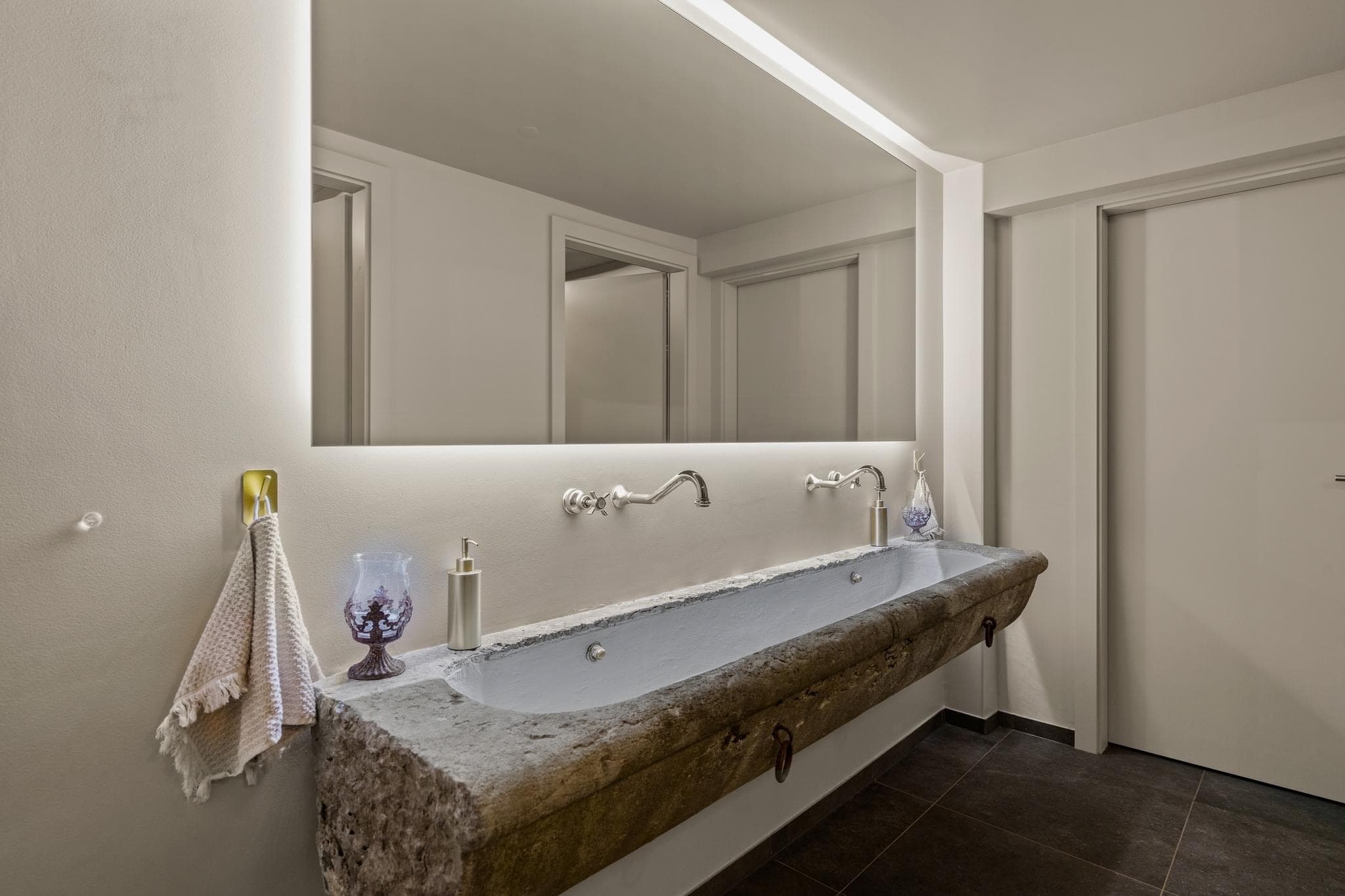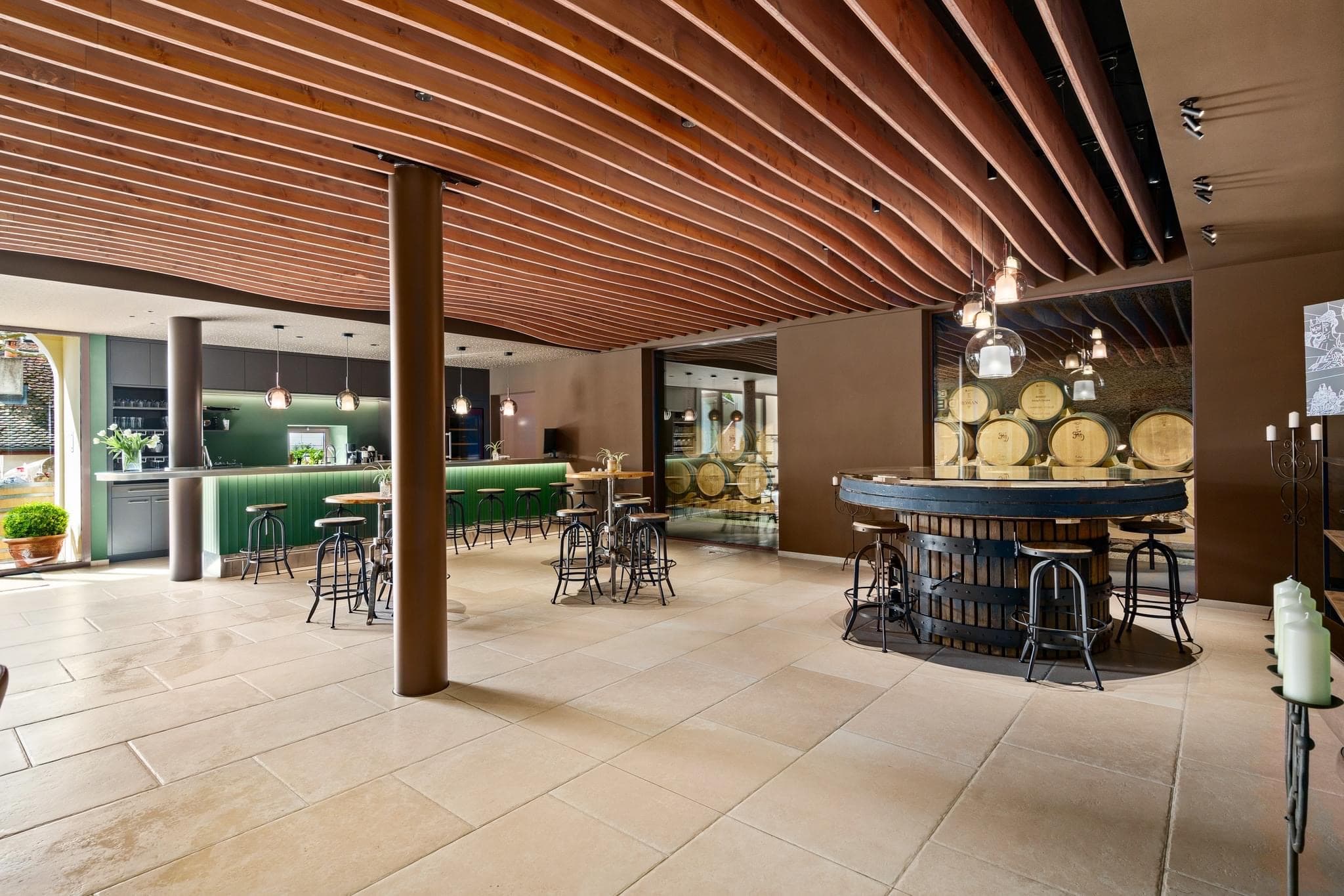 Domaine Debluë Aménagement intérieur d'un carnozet. Au cœur du domaine, l'espace de dégustation et de restauration s'articule autour du vert bouteille, couleur signature qui habille le bar, les murs et les étagères d'exposition. Un plafond en lames de bois cintrées court sur l'ensemble et unifie les volumes. La cave à barriques, visible depuis la salle par une paroi vitrée, s'intègre au décor comme un élément à part entière. Les parois vitrées en fait un élément central, rappelant en permanence l'origine du lieu. Les détails racontent l'identité du domaine : un pressoir ancien reconverti en table de dégustation, une auge en pierre brute transformée en vasque, des suspensions en verre soufflé. Ancien et contemporain s'y côtoient sans artifice.