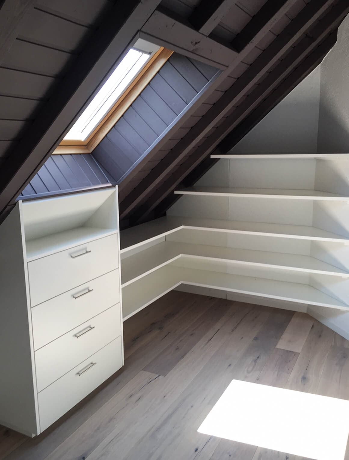 Duplex Zambala Rénovation complète d'un duplex des années 1970 : sol en parquet chêne clair, murs repeints en gris anthracite et escalier en bois naturel avec balustres en câbles inox. La cuisine allie façades grège mat et plan de travail en chêne, avec colonne intégrée four et micro-ondes et cave à vin encastrée. Le dressing sous combles épouse la pente du toit, avec tiroirs et étagères sur mesure en blanc, éclairé par un velux. Les rangements de chambre sont traités en bibliothèque pleine hauteur blanche, avec portes et niches ouvertes.
