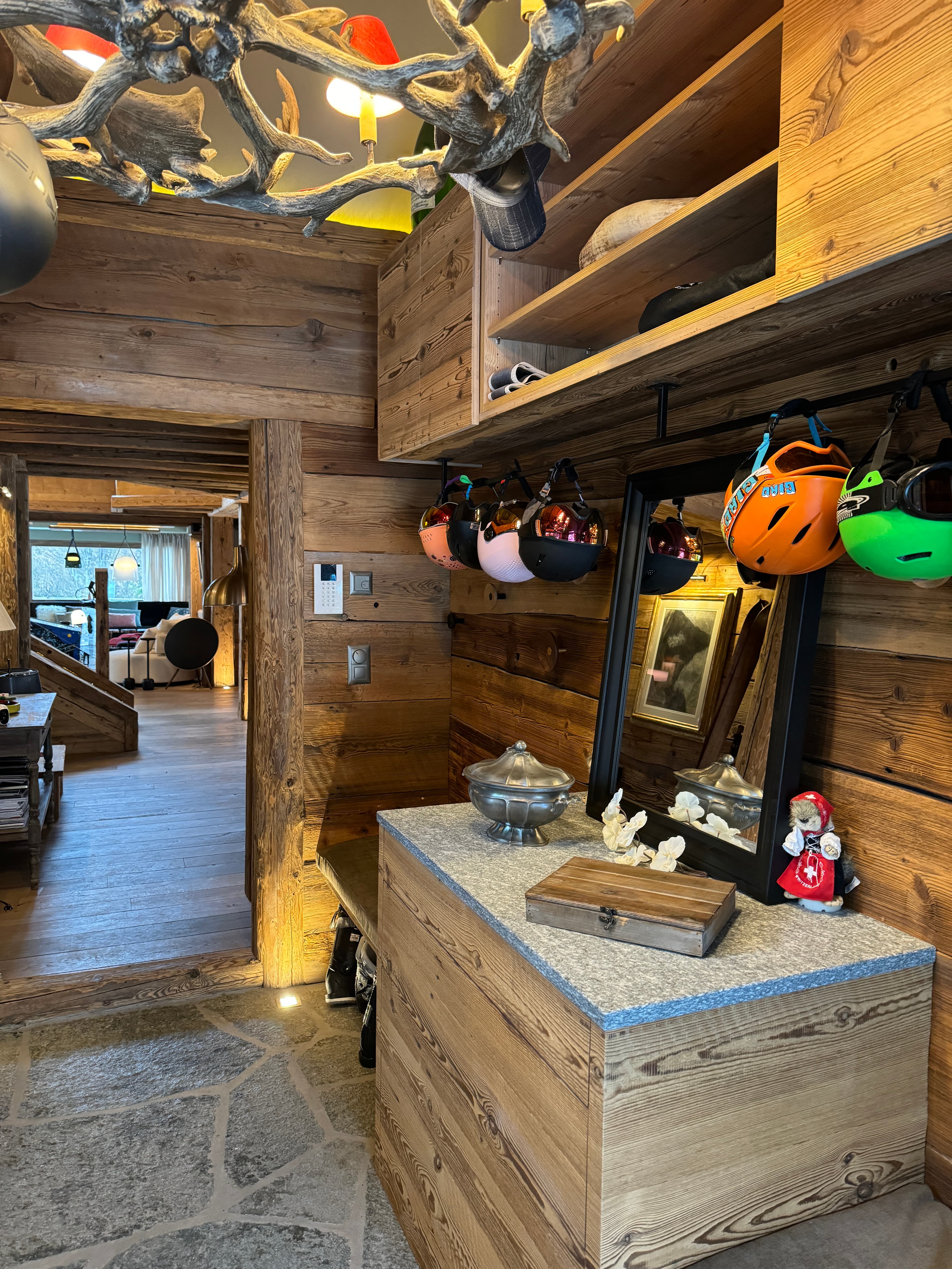 Chalet Kadelpapéo Plusieurs niveaux, plusieurs ambiances, le chalet se déploie comme un récit. Vieux bois et charpente apparente posent le cadre ; le mobilier de créateur, les œuvres d'art et un flipper vintage en font autre chose. Le rez-de-chaussée s'organise en espaces fluides : cuisine ouverte sur la salle à manger, salon, salon TV et véranda suite à un aggrandissement. Chaque niveau développe ensuite sa propre atmosphère, des chambres aux murs rouge bordeaux et boiseries d'époque qui jouent la carte du chalet traditionnel assumé. Les détails contemporains ponctuent l'ensemble sans jamais effacer l'âme du lieu.
